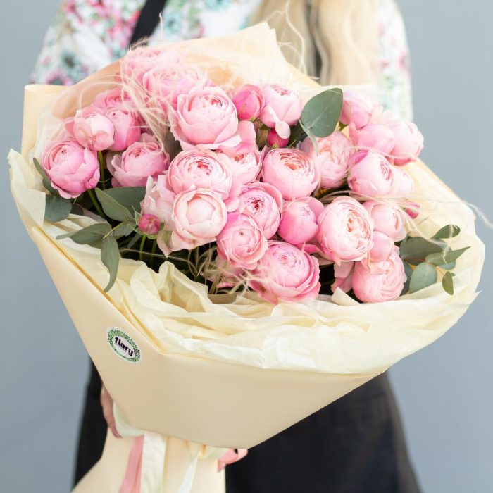 кустовая пионовидная роза сильвия пинк – 10 шт. Стифа – 3 шт. Эвкалипт – 3 шт.