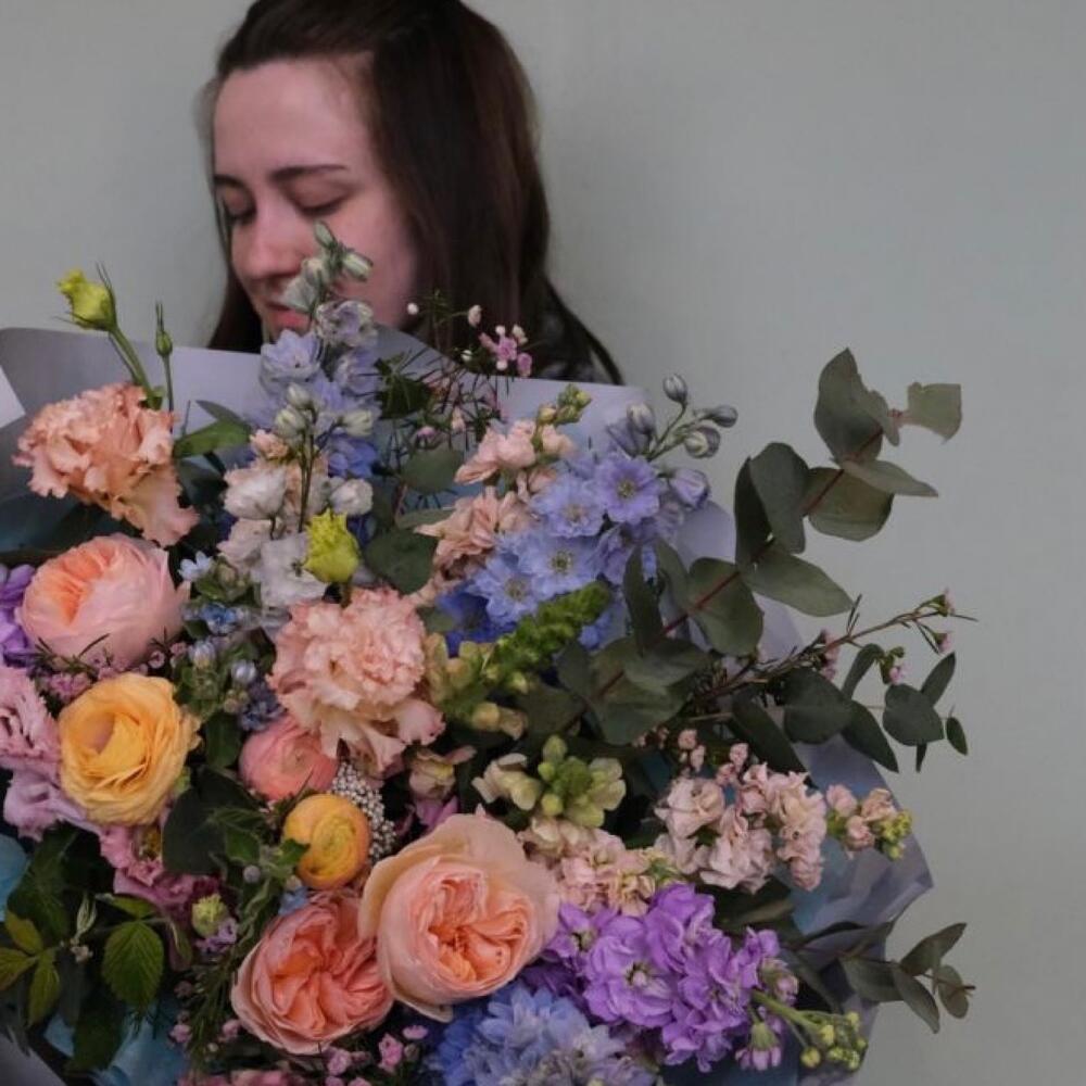 Роза пионовидная – 5 шт.Ранункулюс – 5 шт.Дельфиниум – 5 шт.Маттиола – 3 шт.Эустома – 3 шт.Ваксфлауэр – 2 шт.Озотамнус – 2 шт.Эвкалипт – 5 шт.Львиный зев – 3 шт.Упаковка – 1 шт.