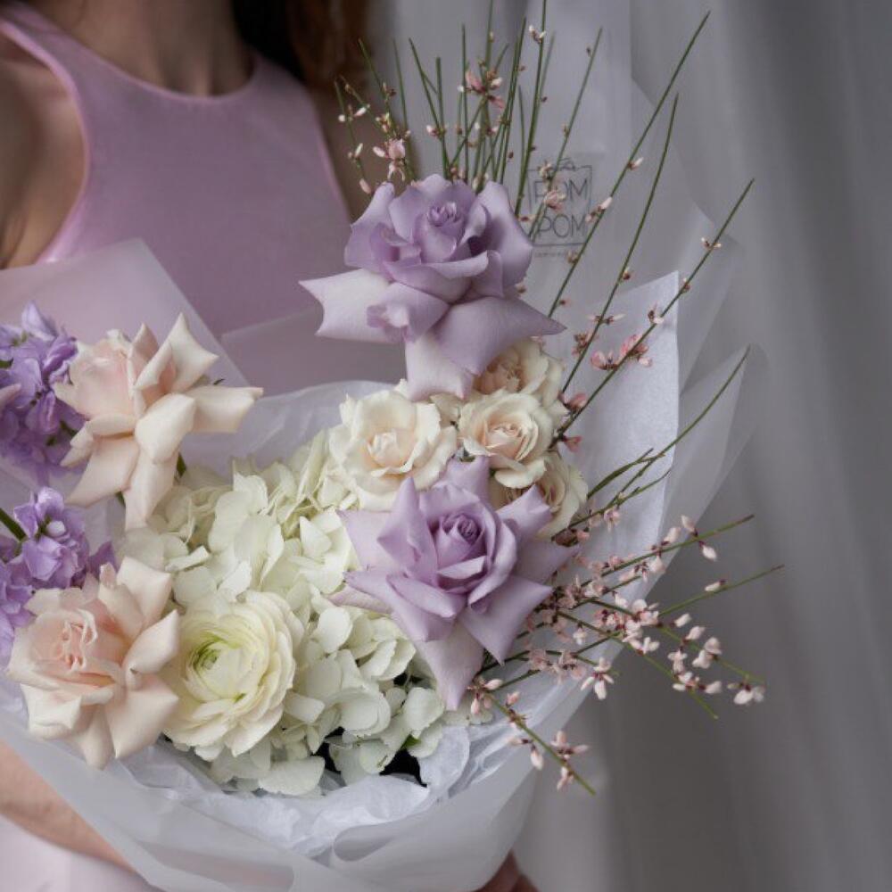 Гортензия – 1 шт.Роза – 6 шт.Гениста – 1 шт.Маттиола – 2 шт.Гвоздика – 2 шт.Ранункулюс – 1 шт.Упаковка дизайнерская – 1 шт.