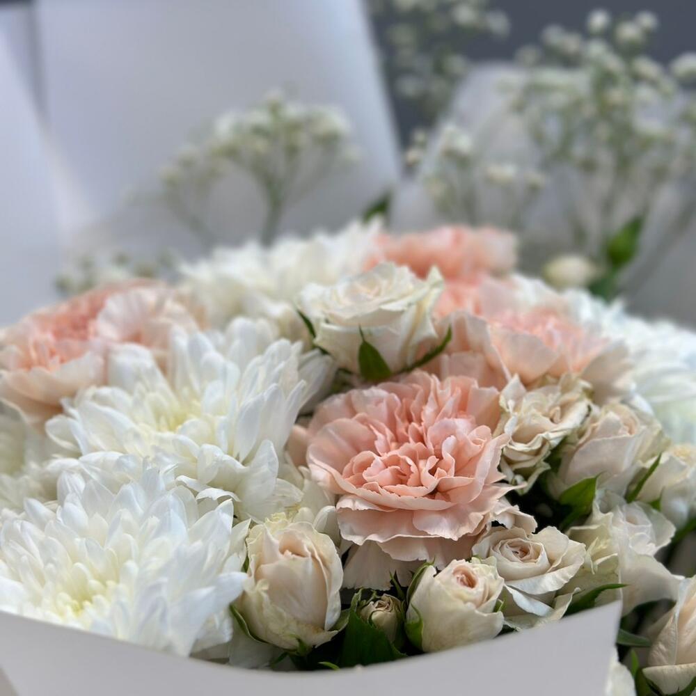 Хризантема кустовая – 3 шт. Гвоздика – 5 шт. Кустовая роза – 5 шт. Гипсофила – 2 шт.