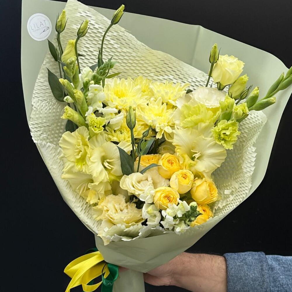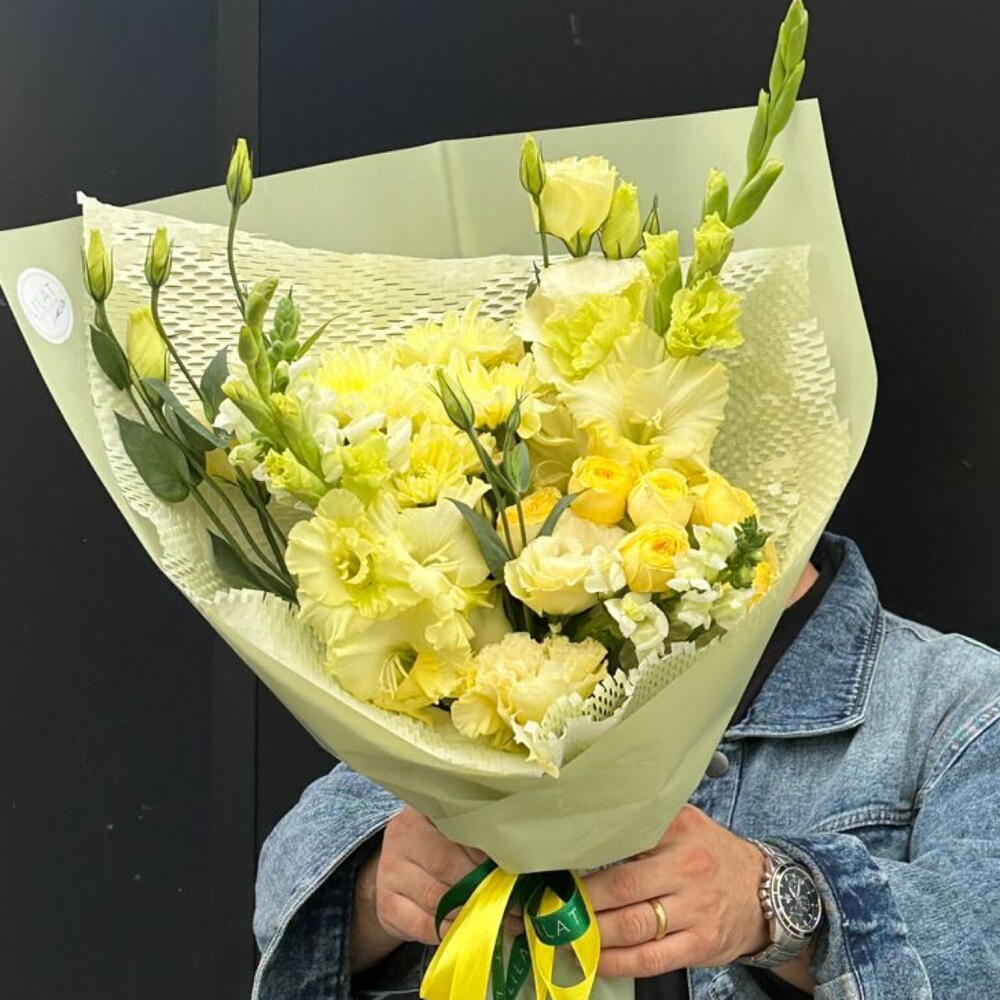 Лизиантус – 3 шт. Кустовая роза – 3 шт. Хризантема кустовая – 3 шт. Гладиолус – 3 шт. Упаковка дизайнерская – 3 шт. Открыточка с вашими пожеланиями – 1 шт.
