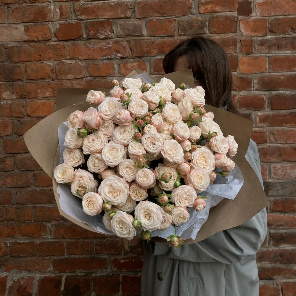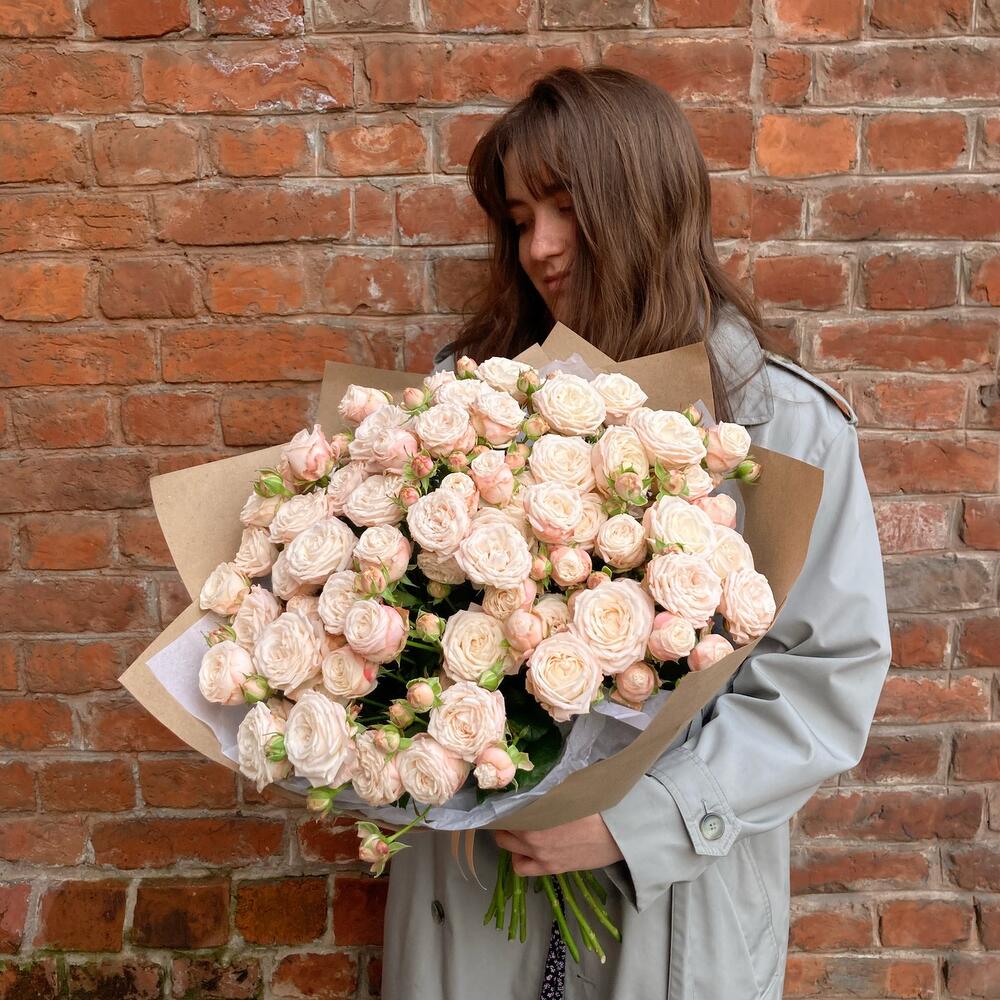 Нежная охапка кустовых пионовидных роз – Бомбастик.Стильное цветочное решение для любого случая.Букет приедет в подарочной коробке, с рекомендациями по уходу за цветами.При необходимости, если букет с нежными цветами или ему предстоит весомое время в дороге – то цветы мы отравляем на воде, останется лишь аккуратно снять кулёчек с водой и поставить букет в подходящую вазу.К каждому букету мы подписываем открытку с вашим посланием – эта услуга, так же в подарок.