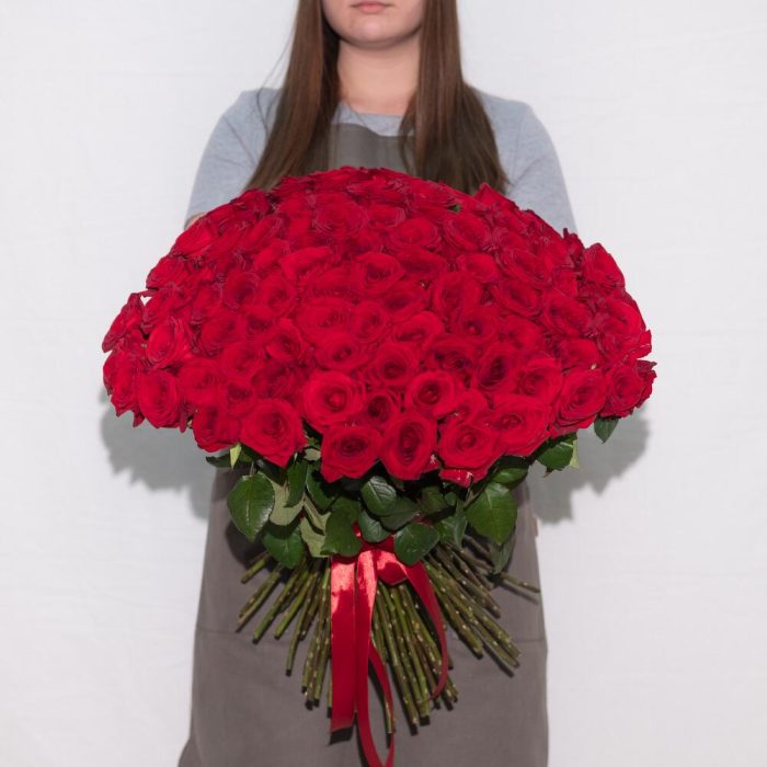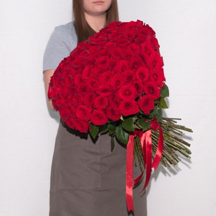 Лента атласная – 2 шт.Красная роза – 101 шт.инструкция по уходу за цветами – 1 шт.любовь флориста (бесплатно) – 1 шт.подкормка для цветов chryzal – 1 шт.