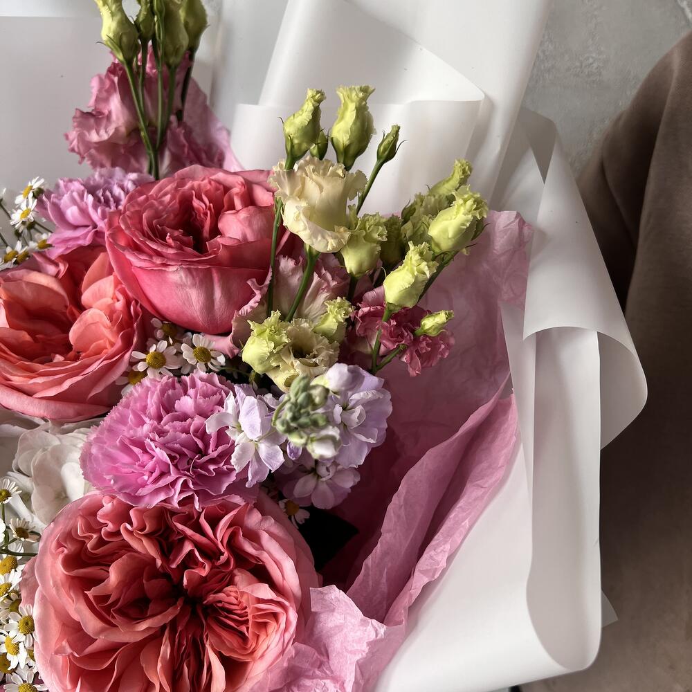 Гортензия – 1 шт.Лизиантус – 3 шт.Маттиола – 3 шт.Роза – 3 шт.Гвоздика – 5 шт.Матрикария – 3 шт.Авторская упаковка – 1 шт.