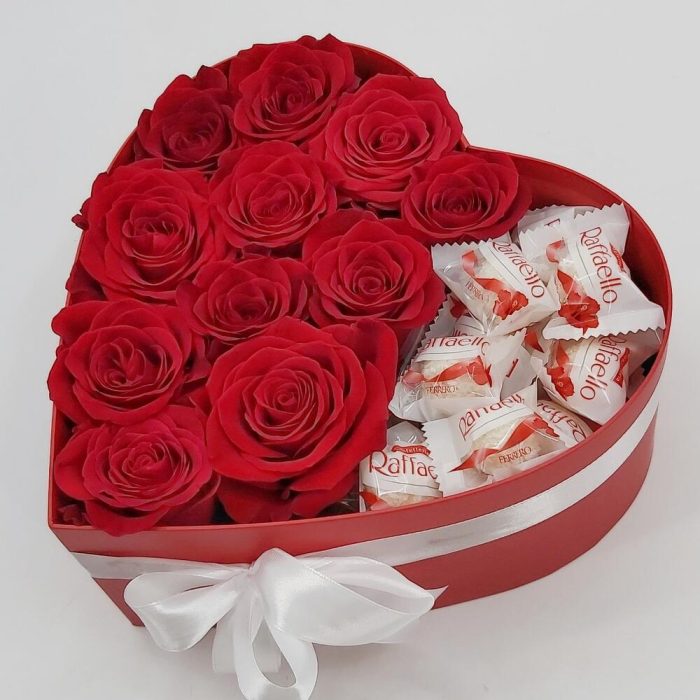 Роза Эквадор Премиум – 11 шт.Конфеты Raffaello – 150 гр.Коробка сердце – 1 шт.Лента атласная – 1 шт.Флористическая губка (оазис) – 2 шт.