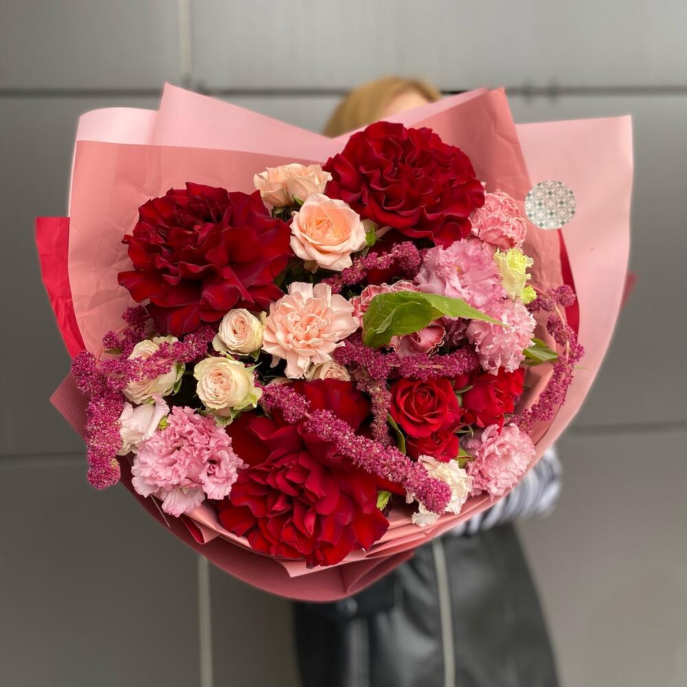 Роза Эквадор – 3 шт.Гвоздика – 3 шт.Амарант – 1 шт.Роза кустовая – 3 шт.