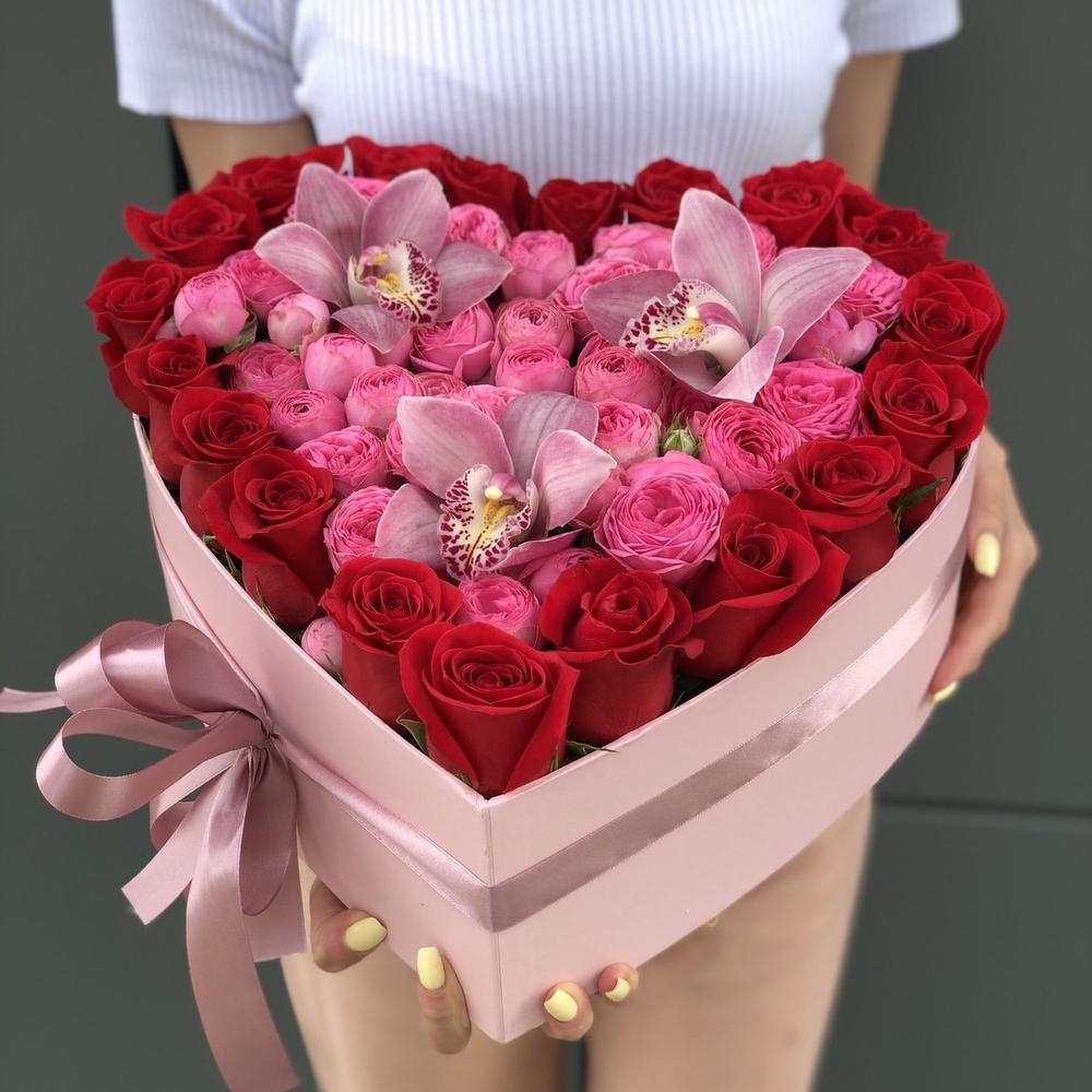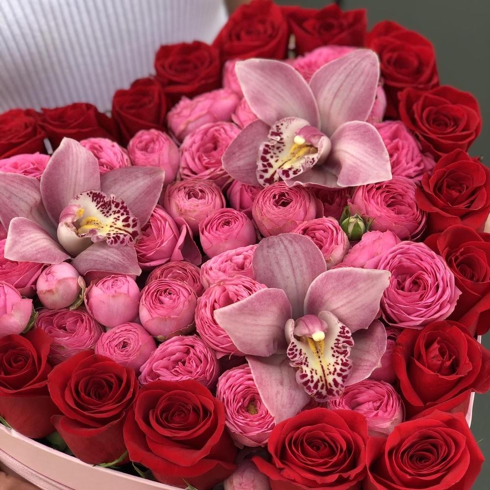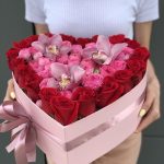 ЦИМБИДИУМ – 3 шт. Кустовая пионовидная роза – 9 шт. роза красная фридом – 21 шт. Оазис – 4 шт. Коробка сердце – 1 шт. Оформление – 1 шт.
