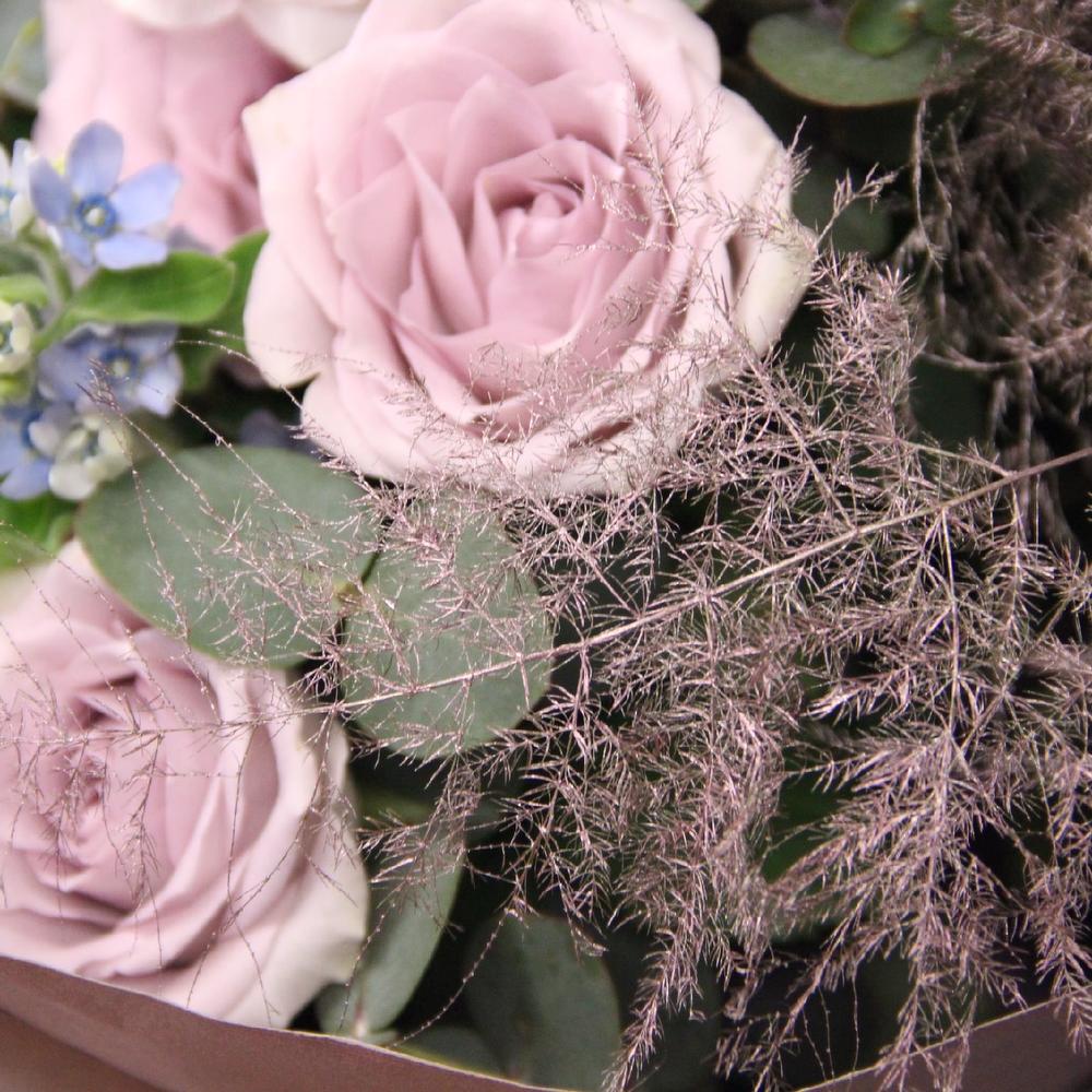 Ранункулюс – 4 шт.Роза Эквадор – 3 шт.Роза пионовидная дэвида остина – 3 шт.Твидия – 3 шт.Озотамнус – 2 шт.Бруния – 1 шт.Аспарагус – 2 шт.Эвкалипт – 7 шт.Вибурнум ягоды – 3 шт.Бумага – 3 шт.Лента атласная – 2 шт.