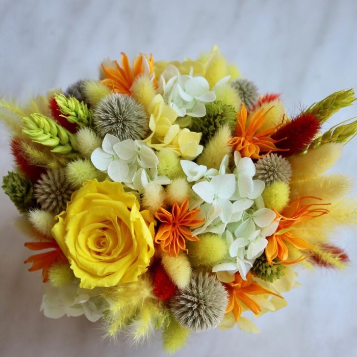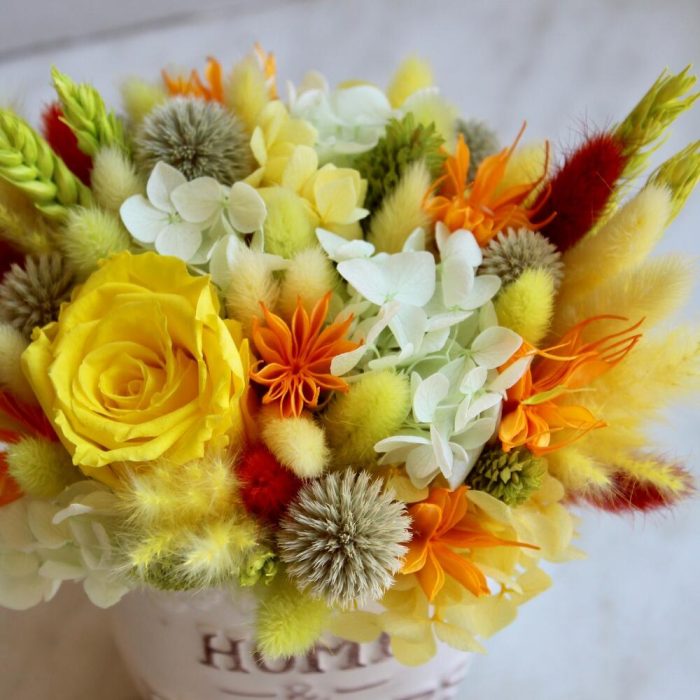 Гортензия – 1 шт.Роза – 1 шт.Колосья – 1 шт.Лагурус – 1 шт.Фаларис – 1 шт.Мордовник – 1 шт.Сетария – 1 шт.Керамическое кашпо – 1 шт.
