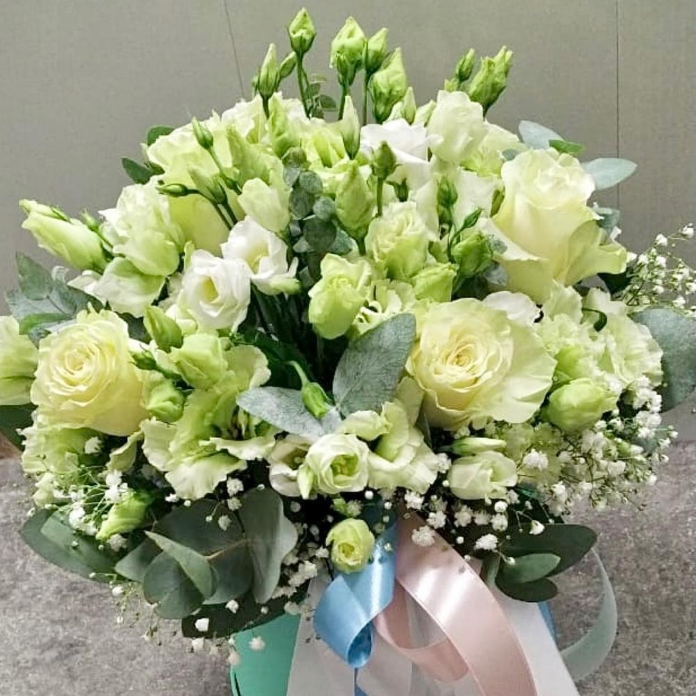 Роза белая – 5 шт.эустома green – 5 шт.Эвкалипт – 5 шт.Гипсофила – 2 шт.Шляпная коробка с лентами – 1 шт.