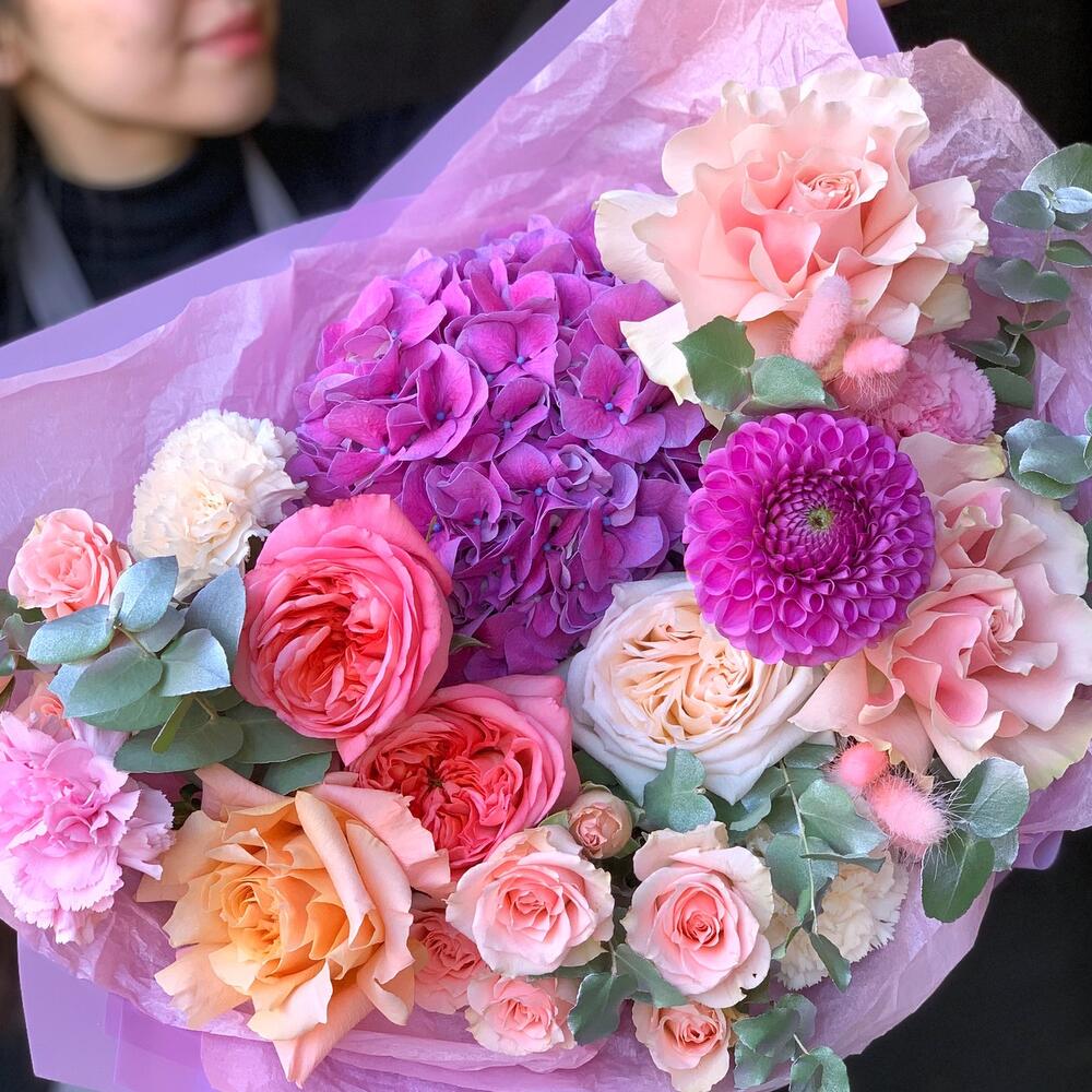 Альстромерии, Гортензии, Кустовые розы, Лизиантусы, Розы, Хризантемы