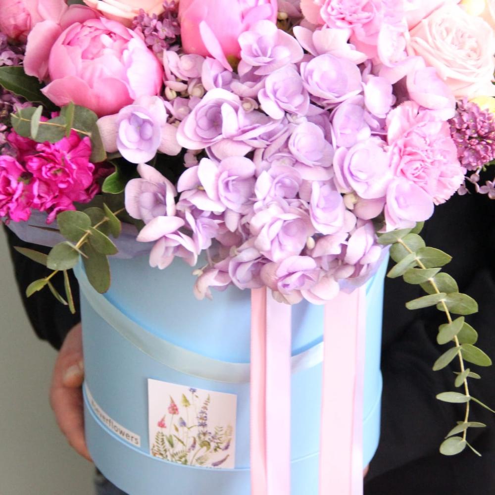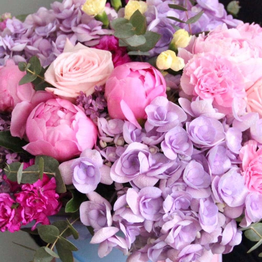 Гортензия – 3 шт.Пионовидная роза – 6 шт.Пион – 5 шт.Маттиола – 4 шт.Гвоздика – 9 шт.Эвкалипт – 7 шт.Шляпная коробка – 1 шт.Лента атласная – 2 шт.Оазис флористический – 1 шт.