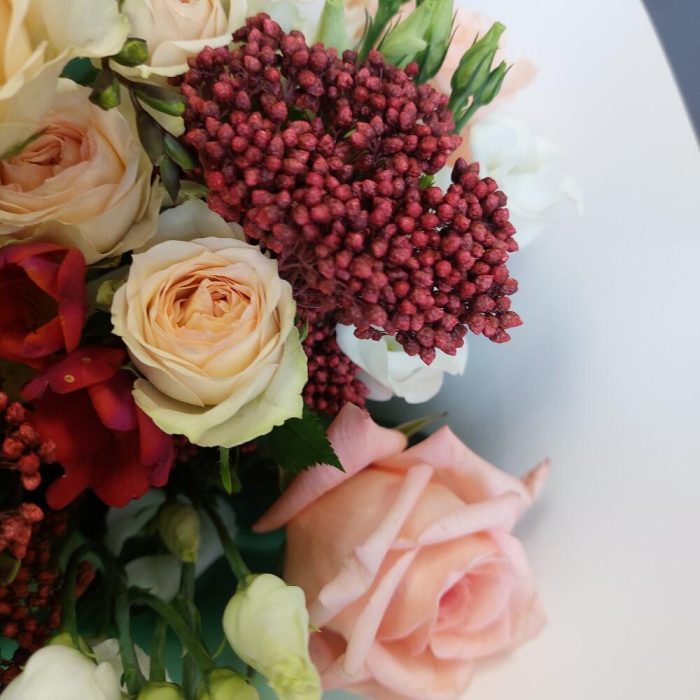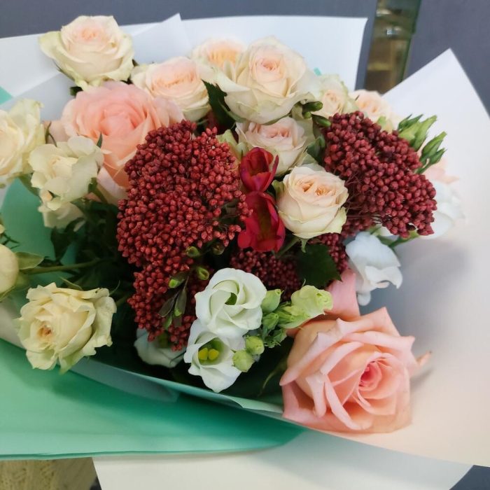 Роза Эквадор 60 см – 3 шт.Лизиантус – 2 шт.Роза кустовая – 2 шт.Озотамнус – 2 шт.Фрезия – 3 шт.Упаковка дизайнерская – 3 шт.Лента атласная – 2 шт.