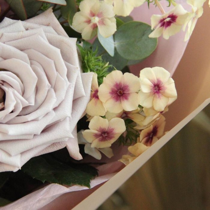 Альстромерии, Гвоздики, Кустовые розы, Лизиантусы, Розы, Хризантемы