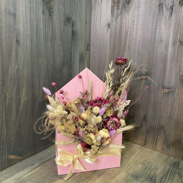 Конверт деревянный – 1 шт.Оазис для сухоцветов – 1 шт.Ковыль – 2 шт.овес сухоцвет – 2 шт.Рожь – 5 шт.Пшеница (сухоцвет) – 10 шт.Лагурус – 25 шт.Лаванда сухоцвет – 10 шт.прочие сухоцветы – 30 шт.
